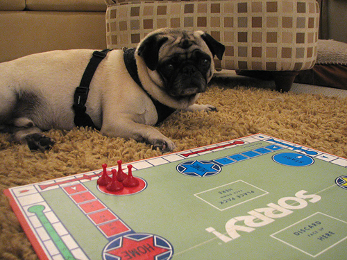 Over the holidays, we found some time to play some board games. Of course the pugs were interested and Henry wanted to play Sorry! with us. I think he thinks we are cheating. Looking forward to your captions in the comments.